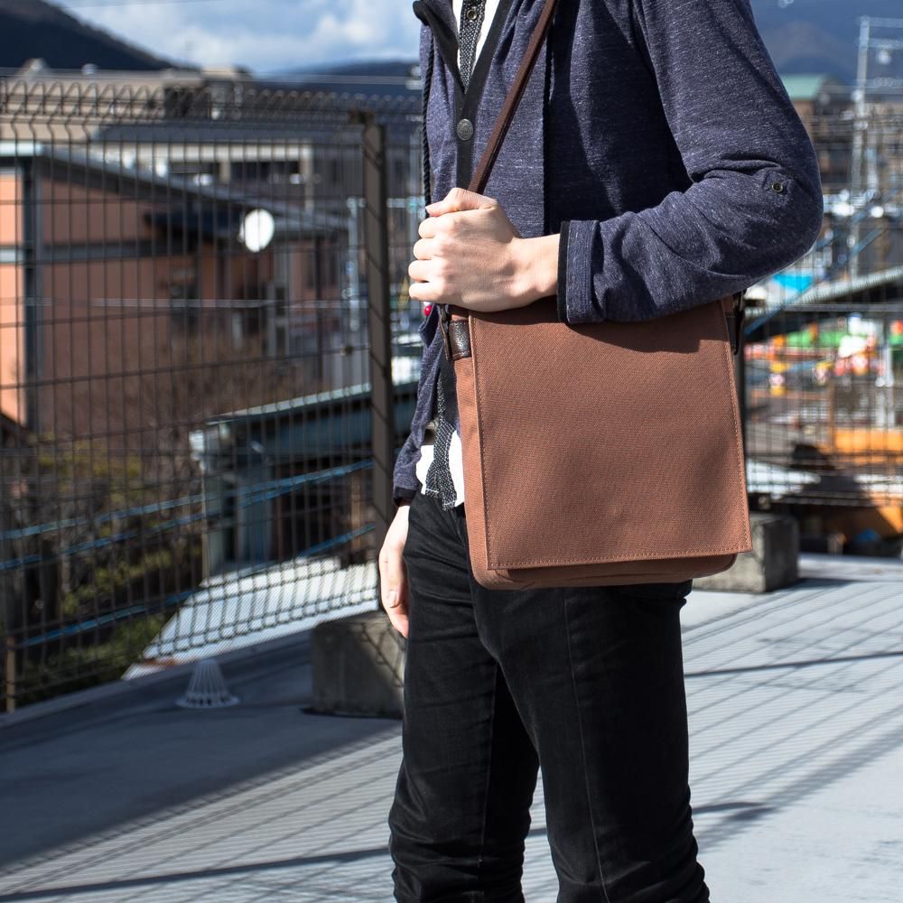 独自の風合いを持つ柿渋染めショルダーが、縦型フラップになりシックな雰囲気を醸し出す。