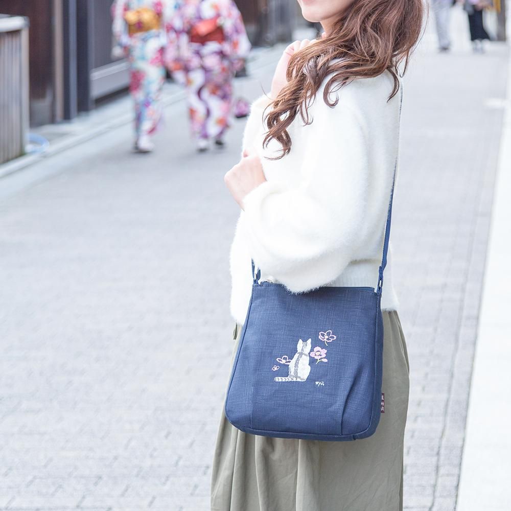 藍渋めと刺繍の組み合わせが何とも上品!!京都の高級刺繍で描いた可愛い猫が、きき定番の使いやすいショルダーバッグと合わさりました。
