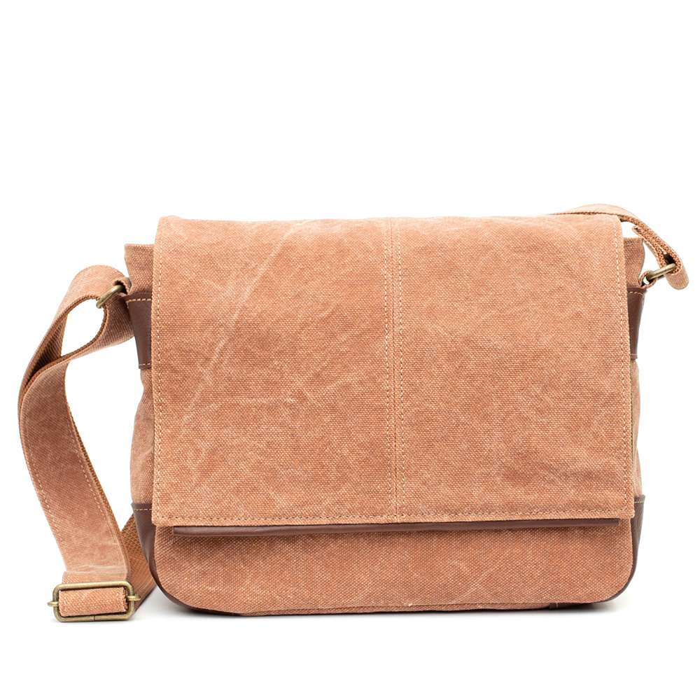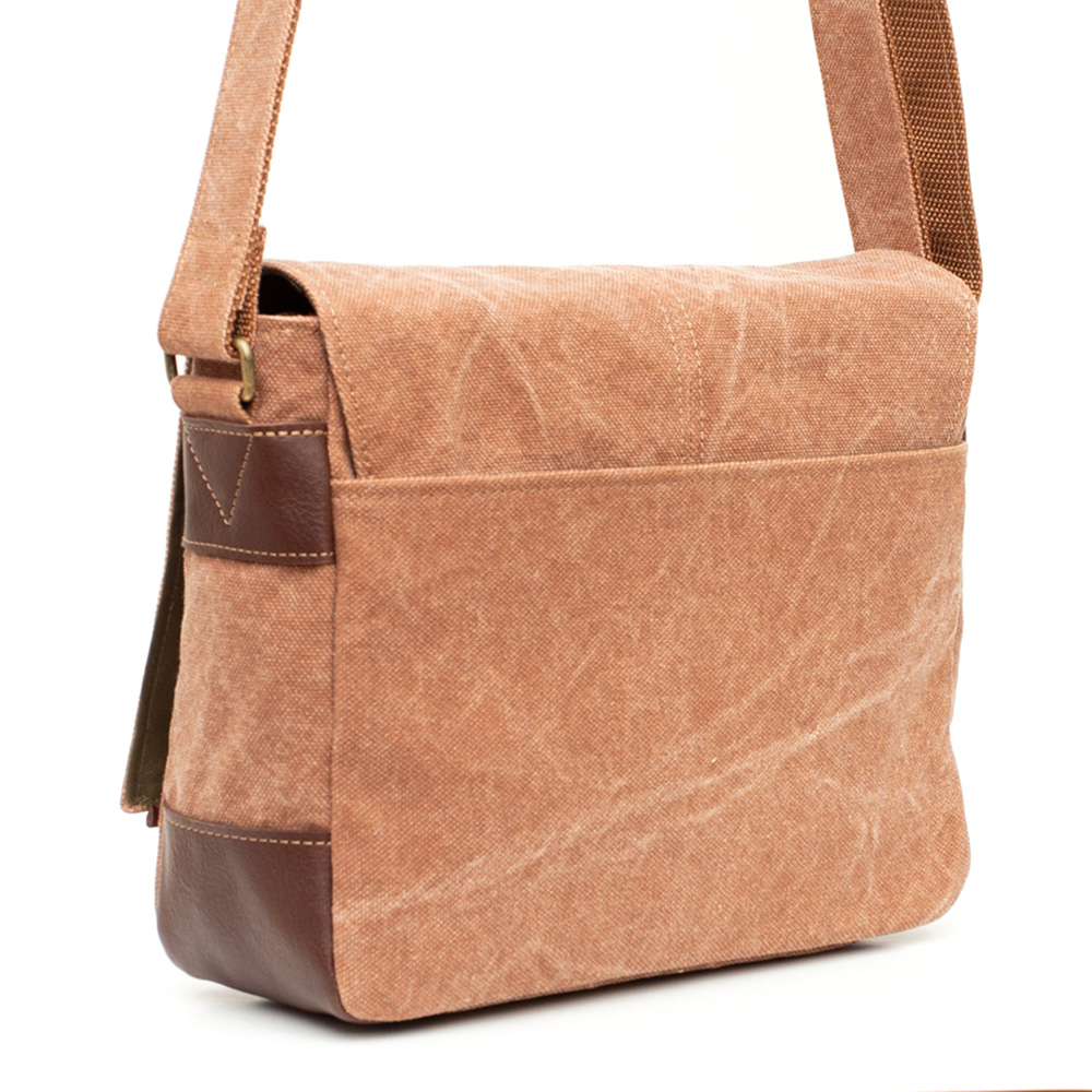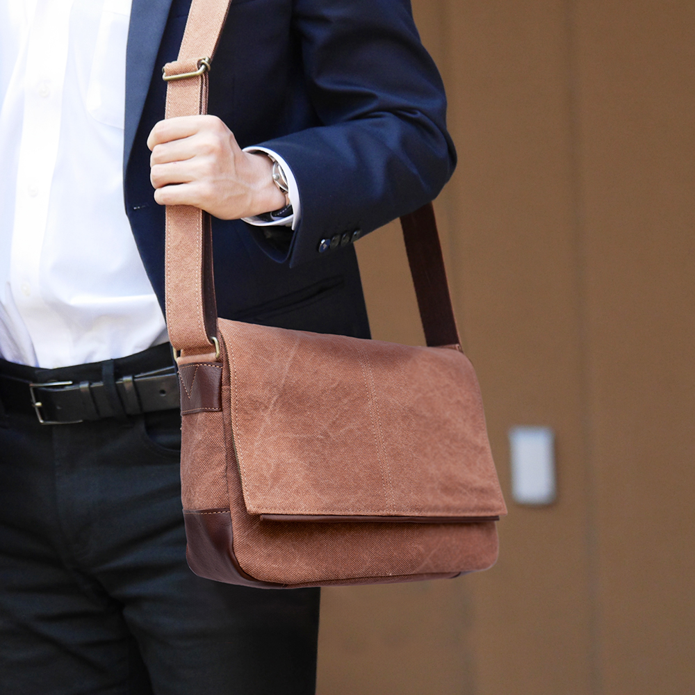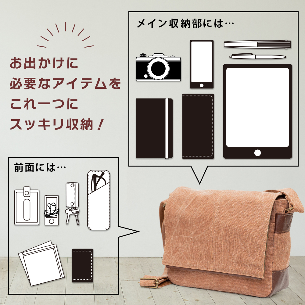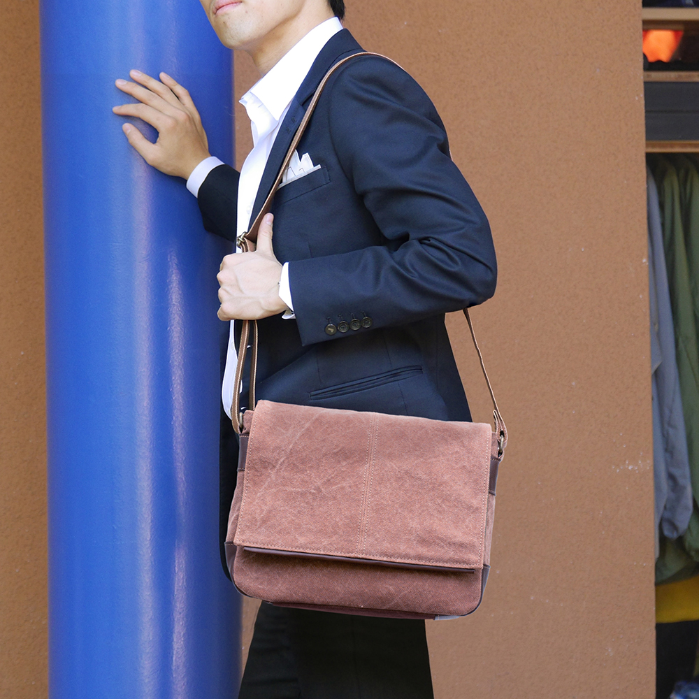 軽く機能性に優れたカジュアル過ぎないフォルムが何時ものスタイル。ボディーにフィットするジャストサイズは町歩きを軽快な気分に導いてくれる、お道具箱の様な楽しい相棒です。素朴な風合の柿渋染め帆布が、使うほどに擦れ跡さえも日々馴染んでいき、自分だけのオリジナルな鞄へと楽しませてくれるでしょう。